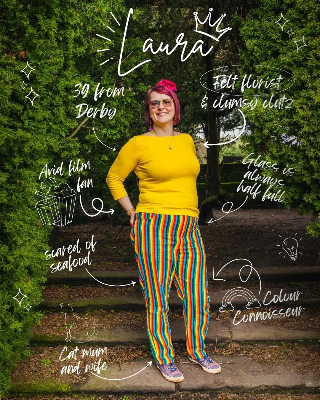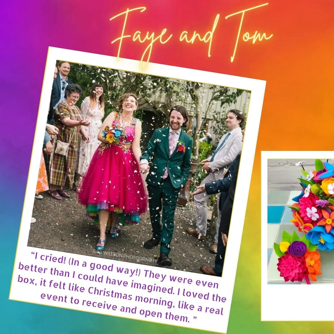 Hi, I’m Laura, She/Her, a felt florist who specialises in vibrant and quirky wedding flowers for all the loved-up couples planning colourful, fun weddings that are jam-packed with personality.